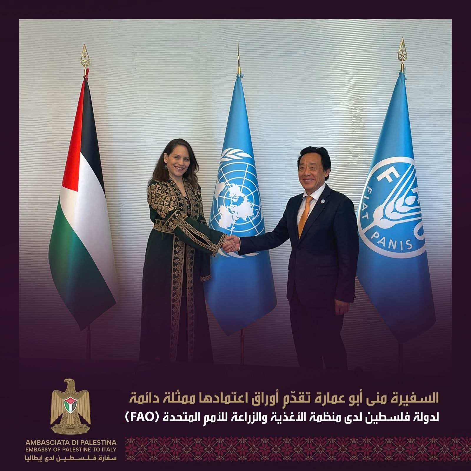 روما – قدّمت سفيرة دولة فلسطين لدى إيطاليا وجمهورية سان مارينو، منى أبو عمارة، أوراق اعتمادها كممثلة دائمة لدولة فلسطين لدى منظمة الأغذية والزراعة التابعة للأمم المتحدة (FAO) إلى المدير العام للمنظمة الدكتور شو دونيو، وذلك خلال مراسم رسمية أُقيمت في مقر المنظمة بالعاصمة الإيطالية روما.