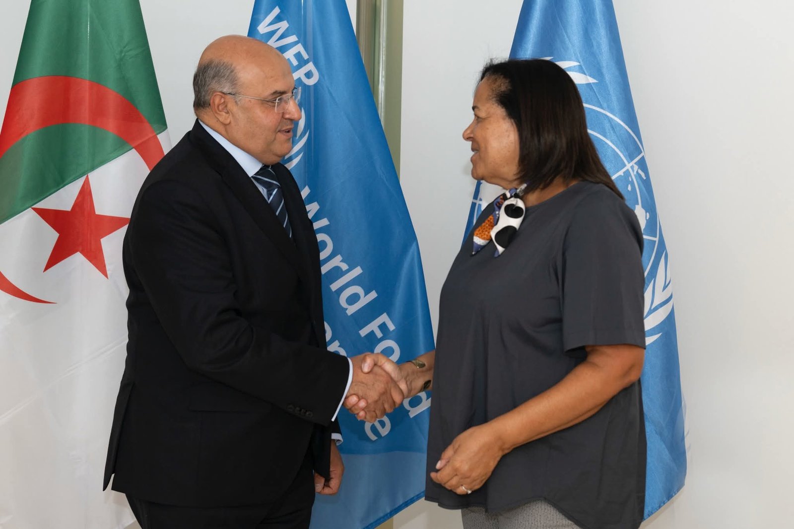 التقى سعادة السفير والممثل الدائم للجزائر لدى المنظمات الدولية التابعة للأمم المتحدة بروما (إيطاليا)، السيد محمد خليفي، يوم 24 سبتمبر 2025، بالسيدة فاليري غوارنييري (Valerie Guarnieri) ، نائبة المديرة التنفيذية المكلفة بالبرامج والعمليات، لدى برنامج الأغذية العالمي، وذلك بمقر ذات البرنامج بروما.
