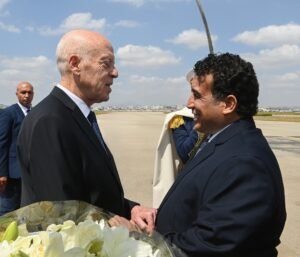 آيسك.. استقبل رئيس الجمهورية قيس سعيّد، يوم أمس الثامن عشر من شهر أوت الجاري بمطار تونس قرطاج الدولي، فخامة الرئيس محمد يونس المنفي رئيس المجلس الرئاسي الليبي الذي أدّى زيارة عمل إلى تونس. وحيّا الرئيسان العلم على أنغام النشيد الوطني لكلا البلدين إلى جانب استعراض تشكيلة شرفيّة من الجيوش الثلاثة أدّت لهما التحية.