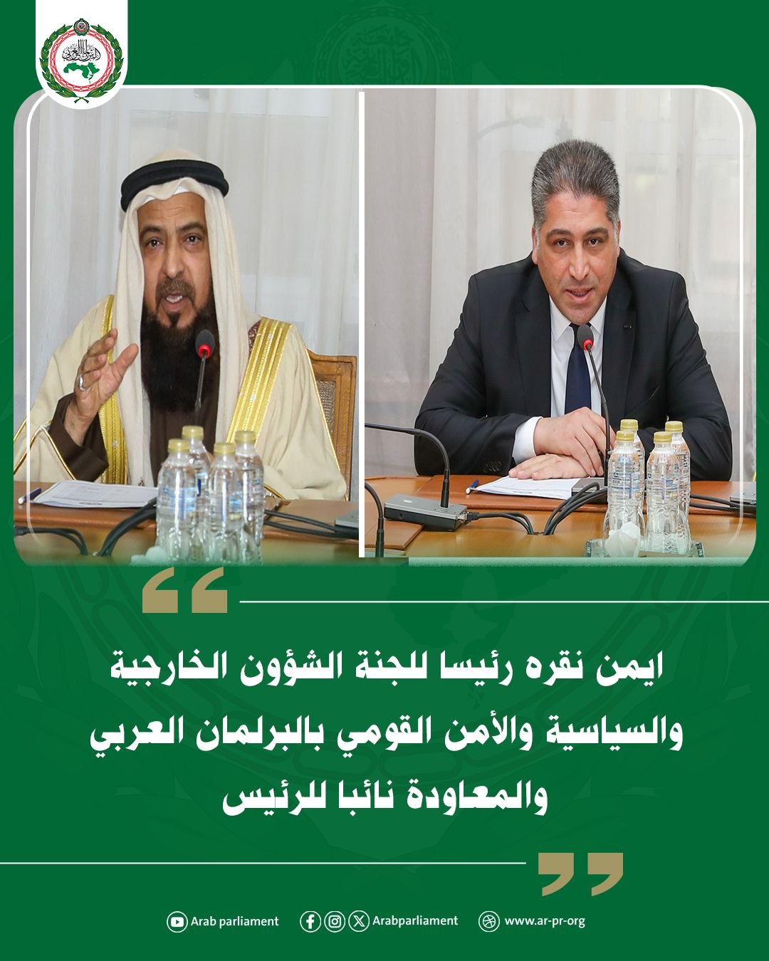 فاز معالي النائب أيمن نقره بمنصب رئيس لجنة الشؤون الخارجية والسياسية والأمن القومي التابعة للبرلمان العربي بالتزكية، كما فاز معالي النائب عادل المعاودة بمنصب نائب رئيس اللجنة.