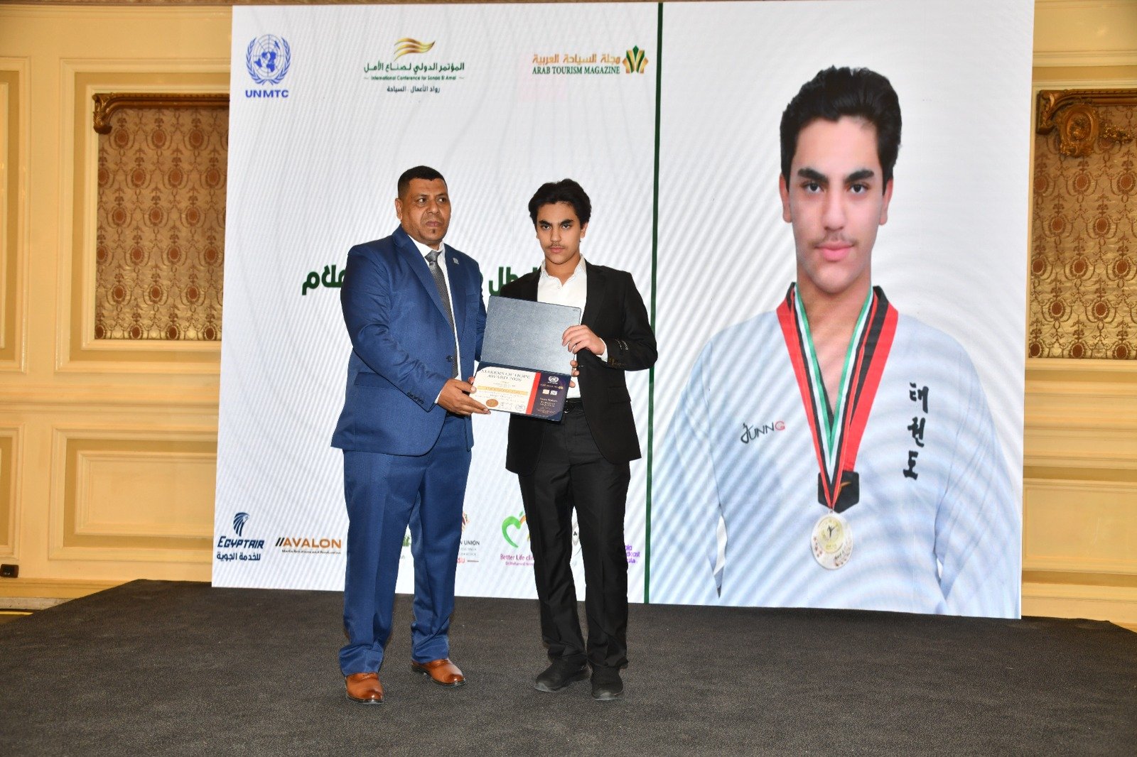 وقد شهدت الفعالية حضوراً بارزاً للدكتورة جيهان زكي، وزيرة الثقافة المصرية، التي شاركت في هذا المحفل الدولي لتكريم الشخصيات المؤثرة، مما أضفى صبغة رسمية وثقافية رفيعة على الحدث الذي نظمته منظمة الأمم المتحدة للتدريب والإعلام، سلم البطل خالد محمود علام الجائزة مدير عام المنظمة في منطقة الشرق الأوسط وشمال أفريقيا الاستاذ محمد أبوزيد.