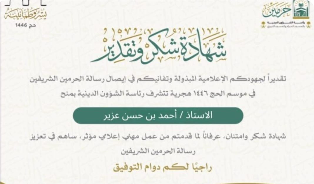 آيسك.. تلقّى مدير عام صحيفة سهم.. الأستاذ أحمد عزير ، شهادة شكر وتقدير من رئاسة الشؤون الدينية بالمسجد الحرام والمسجد النبوي ، عرفانآ بجهوده ، وبتميّز الصحيفة خلال موسم حج هذا العام 1446هـ .