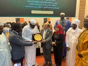 جاء ذلك على هامش فعاليات الملتقي الدولي السادس للمؤتمر الأفريقي لتعزيز السلم، برئاسة العلامة الشيخ عبد الله بن بيه، والذي عقد تحت رعاية رئيس جمهورية موريتانيا، السيد محمد ولد الشيخ الغزواني ، تحت شعار: “إفريقيا وصناعة الأمل: لا يأس من رحمة الله”. في الفترة 10-11-12 فبراير، بقصر المؤتمرات بالعاصمة الموريتانية نواكشوط، وذلك بحضور معالي الوزير أحمد عمر مبعوث الرئيس التشادي وزير الأراضي بجمهورية تشاد، والذي تسلم الدرع نيابة عن الرئيس ومعالي الوزير جبريل سعيد عمه مستشار رئيس الجمهورية للشؤون الدينية، الدكتور أبكر ولر مدو الأمين العام للمجلس الوطني للشؤون الإسلامية في جمهورية تشاد، ورئيسًا لرابطة علماء دول الساحل، والدكتورة دينا العشري نائب رئيس جامعة النيل الأوروبية للتعاون الدولي والعلاقات الخارجية، ومعالي السفير الشيخ الدكتور أحمدو با ممدود، ممثل جامعة النيل الأوروبية في فرنسا ورئيس المجلس الوطني للأئمة بفرنسا، والدكتورة غادة فؤاد رئيس المركز الأفريقي للابحاث، والأمين العام لمؤسسة النيل الرقمية للتعليم والتنمية المستدامة، والعديد من الأكاديميين والباحثين، حيث أعرب رئيس جامعة النيل الأوروبية عن خالص تهانيه لفخامة الرئيس محمد ادريس دبيي لحصوله على جائزة أفريقيا للسلم لعام 2026م، كما أكد دكتور محمد خليل على دور جامعة النيل الأوروبية في تعزيز النشاط الأكاديمي والاهتمام بعقد دورات تدريبية لتنمية القدرات البحثية والأكاديمية للطلاب الأفارقة، ومن جانبه أشار مبعوث الرئيس التشادي السيد الوزير أحمد عمر إلى ضرورة الاهتمام بتطوير نشاط جامعة النيل الأوروبية داخل جمهورية تشاد تمهيدا للانطلاق تجاه باقي الدول الأفريقية، مع ضرورة نشر ثقافة السلم وتعزيز الحوار مع جميع الأشقاء داخل الدول الأفريقية.
