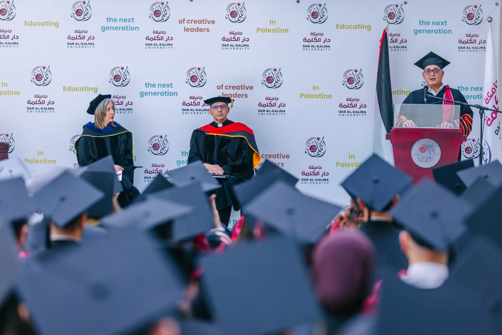 وأضاف: “أيتها الخريجات، أيها الخريجون، إن جيلكم لأمام تحدٍ وجودي: أن نكون أو لا نكون، يحاول الاحتلال بكل ما أوتي من جبروت ألا يبقي لشعبنا أي أثر، ففي غزة دمر الجامعات، قصف المدارس، حطم المتاحف، وها هو يحاول أن يشتت شملنا بتطهير عرقي ممنهج، في الضفة الغربية يشن حرباً على المخيمات كي يمحو أثر النكبة الأولى وحق العودة، فالحرب اليوم هي على الأثر. قد يدمر الاحتلال بعضاً من آثارنا، ولكنه لن يقدر على محو الأثر. فأثر الفراشة لا يزول.”