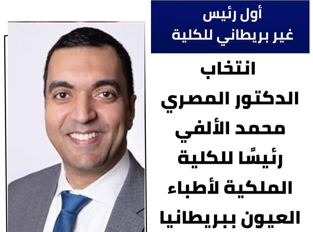 تم انتخاب الدكتور محمد الألفى رئيسًا للكلية الملكية لأطباء العيون، ليصبح أول رئيس غير بريطاني يتولى هذا المنصب.