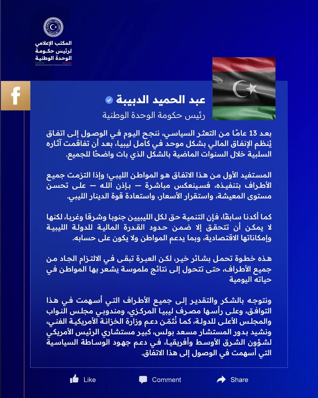 ونتوجه بالشكر والتقدير إلى جميع الأطراف التي أسهمت في هذا التوافق، وعلى رأسها مصرف ليبيا المركزي، ومندوبي مجلس النواب والمجلس الأعلى للدولة، كما نُثمّن دعم وزارة الخزانة الأمريكية الفني، ونشيد بدور المستشار مسعد بولس، كبير مستشاري الرئيس الأمريكي لشؤون الشرق الأوسط وأفريقيا، في دعم جهود الوساطة السياسية التي أسهمت في الوصول إلى هذا الاتفاق.”