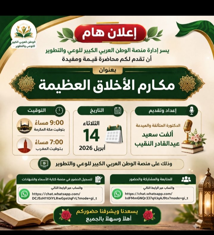 في إطار جهودها المستمرة لنشر الوعي المجتمعي وترسيخ القيم الإنسانية الرفيعة، أعلنت منصة الوطن العربي الكبير للوعي والتطوير عن تنظيم محاضرة توعوية مميزة بعنوان “مكارم الأخلاق العظيمة”، وذلك مساء اليوم الثلاثاء الموافق 14 أبريل 2026.