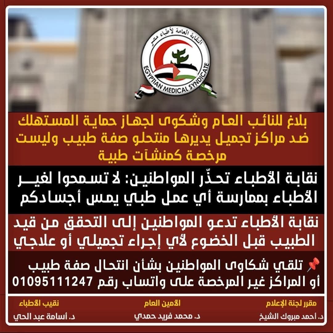 تتقدم نقابة أطباء مصر ببلاغ رسمي إلى النائب العام وشكوى إلى جهاز حماية المستهلك، ضد عدد من مراكز التجميل ويمارس فيها غير الأطباء إجراءات طبية تشكل خطرًا جسيمًا على حياة المواطنين، وأودت بحياة بعض المواطنين نتيجة حقن مواد أحدثت حساسية لهم، تلقي شكاوى المواطنين بشأن انتحال صفة طبيب على واتساب رقم 0109511124.