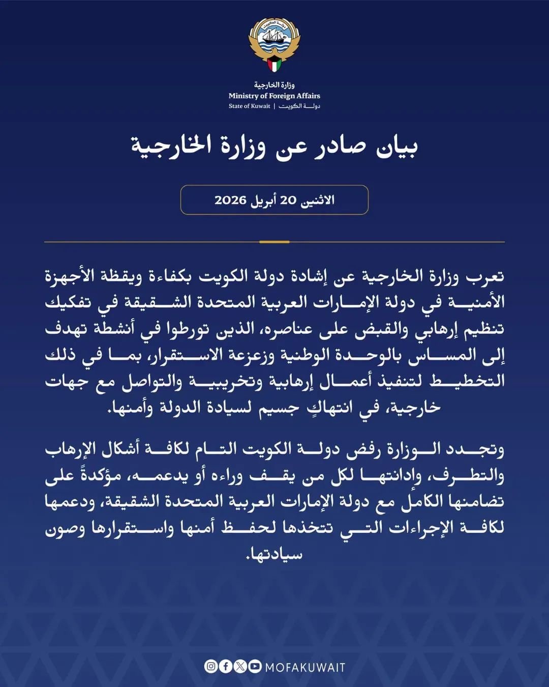 تعرب وزارة الخارجية عن إشادة دولة الكويت بكفاءة ويقظة الأجهزة الأمنية في دولة الإمارات العربية المتحدة الشقيقة في تفكيك تنظيم إرهابي والقبض على عناصره، الذين تورطوا في أنشطة تهدف إلى المساس بالوحدة الوطنية وزعزعة الاستقرار، بما في ذلك التخطيط لتنفيذ أعمال إرهابية وتخريبية والتواصل مع جهات خارجية، في انتهاكٍ جسيم لسيادة الدولة وأمنها.