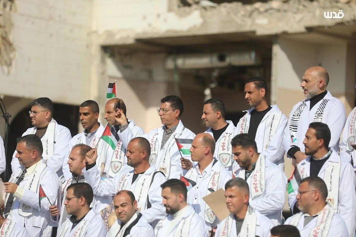 وزارة الصحة بغزة تنظم حفل تخريج للأطباء الحاصلين على البورد الفلسطيني في ساحة مجمع الشفاء الطبي بمدينة غزة»