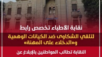 نقابة الأطباء تخصص رابط لتلقي الشكاوى ضد الكيانات الوهمية و«الدخلاء على المهنة» النقابة تطالب المواطنين بالإبلاغ عن أي ممارسات غير…