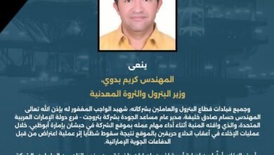 وزير البترول ينعي شهيد الواجب المهندس حسام صادق خليفة مدير عام مساعد الجودة بشركة بتروجت – فرع دولة الإمارات ينعي…