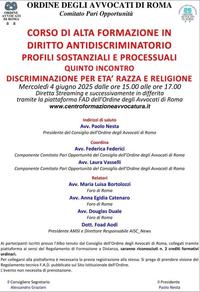 ROMA 5 GIU 2025 – È stato un incontro denso di spunti giuridici, analisi culturali e testimonianze concrete quello svoltosi mercoledì 4 giugno 2025, dalle ore 15:00 alle 17:00, in diretta streaming e in differita FAD, nell’ambito del Corso di Alta Formazione in Diritto Antidiscriminatorio – Profili Sostanziali e Processuali organizzato dal Comitato Pari Opportunità dell’Ordine degli Avvocati di Roma.
