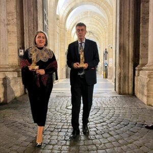 Accanto a lui, è stata premiata anche Wafaa Nahas, Presidente dell’Unione Arabi del 1948 e membro del direttivo di Uniti per Unire e dell’unione sportiva Euro mediterranea(USEM), arrivata da Nazareth per testimoniare l’impegno della comunità araba del Medio Oriente. “Come donna cristiana e rappresentante della realtà importante ed attiva tutti i giorni dei cristiani in Medio Oriente,” ha dichiarato Wafaa Nahas, “credo nell’importanza dell’integrazione interculturale e interreligiosa. La mia presenza qui è anche un richiamo alla pace e alla cooperazione tra popoli e religioni. Abbiamo lanciato un appello insieme al Presidente del Movimento Uniti per Unire Prof. Foad Aodi affinché ci sia un cessate il fuoco, corridoi sanitari per chi è in difficoltà e il rispetto per la popolazione civile. Sosteniamo il messaggio di Papa Francesco e il suo costante appello alla pace, che rappresenta un grido spesso inascoltato, ma fondamentale per milioni di persone.”
