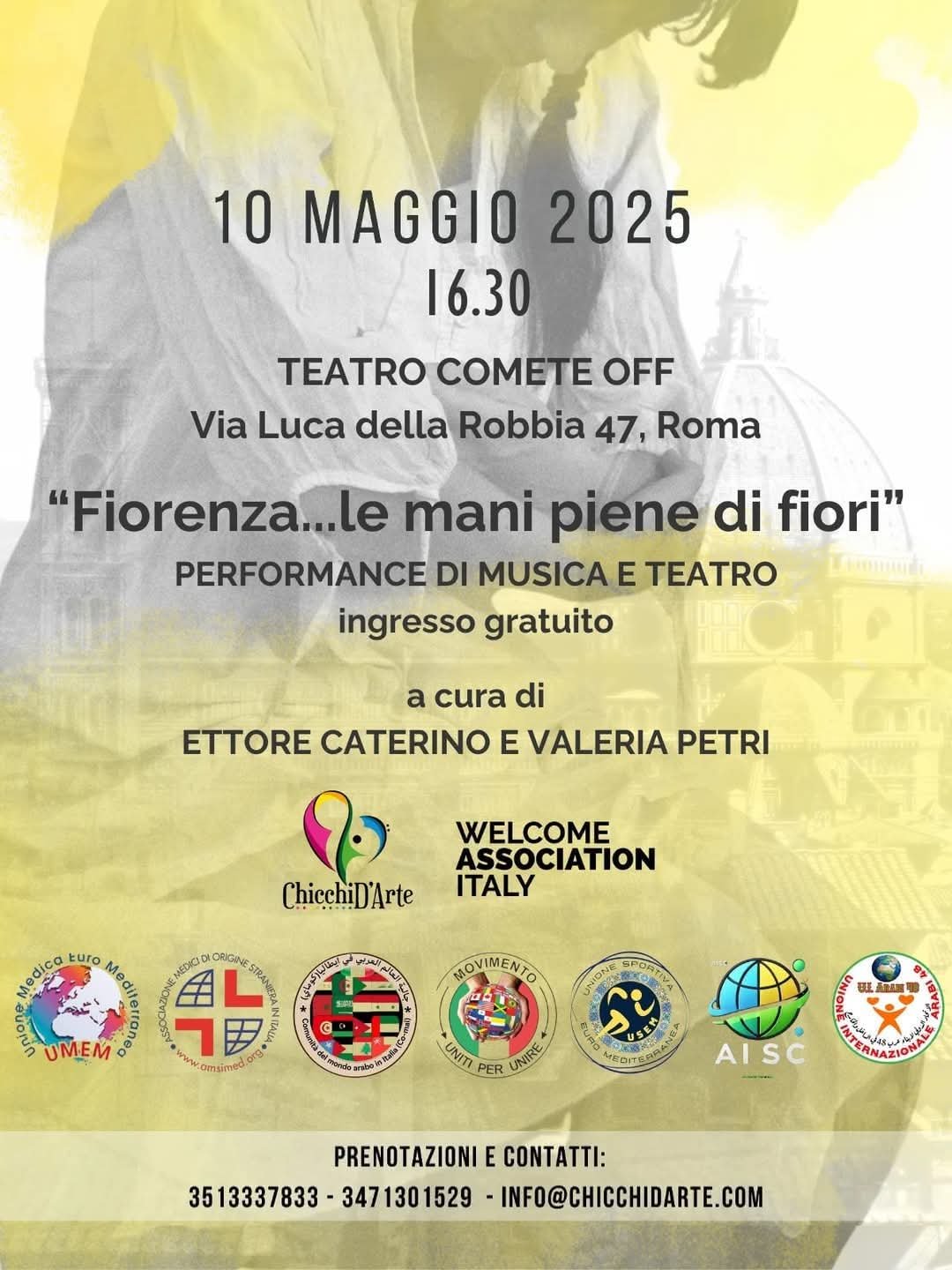 “Siamo orgogliosi di sostenere e promuovere l’evento ‘Fiorenza… le mani piene di fiori’, un’iniziativa che intreccia arte, memoria e accoglienza. Questo progetto incarna pienamente i valori che la Welcome Association Italy porta avanti ogni giorno: inclusione, cultura e partecipazione attiva. Un ringraziamento particolare al Prof. Aodi per la sua preziosa partecipazione e per il costante impegno nel ruolo di divulgatore e promotore di percorsi di sensibilizzazione sui temi sociali più urgenti.”