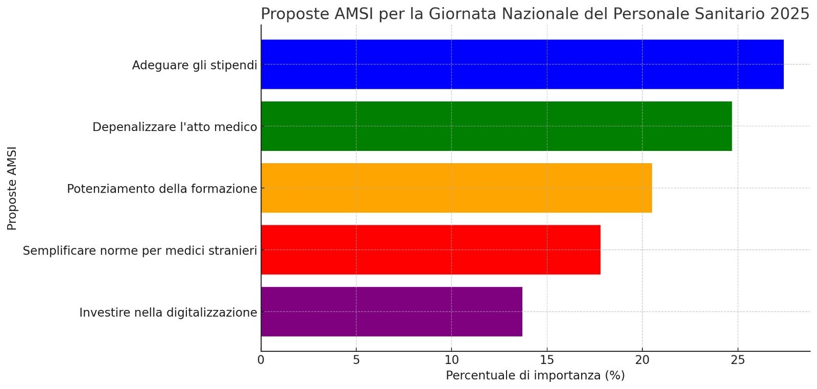 Il grafico in allegato rappresenta le principali proposte avanzate dall’AMSI (Associazione Medici di Origine Straniera in Italia) per il miglioramento del sistema sanitario italiano. Ogni proposta è stata valutata in base alla sua importanza, con una ripartizione percentuale dei punteggi assegnati.