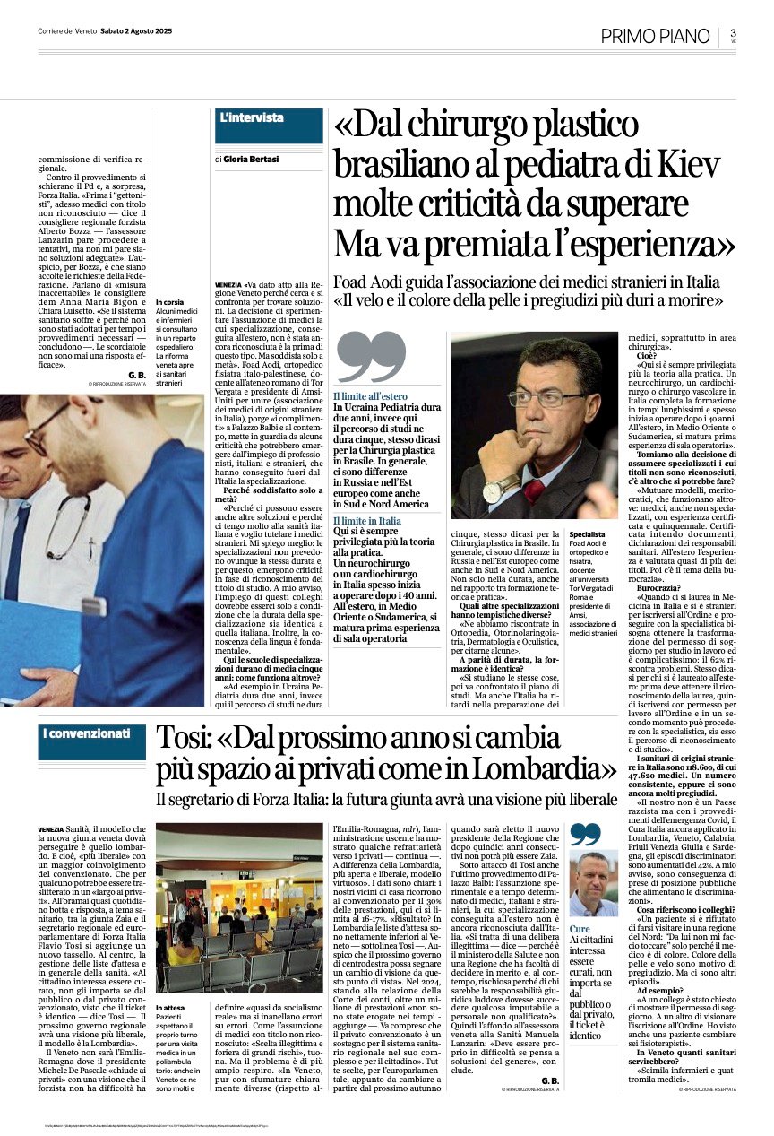 RASSEGNA STAMPA 2 AGOSTO 2025 / SALUTE. IL PROF. FOAD AODI INTERVISTATO DAL CORRIERE DEL VENETO SULLA REALTA’ DEI PROFESSIONISTI SANITARI STRANIERI IN ITALIA